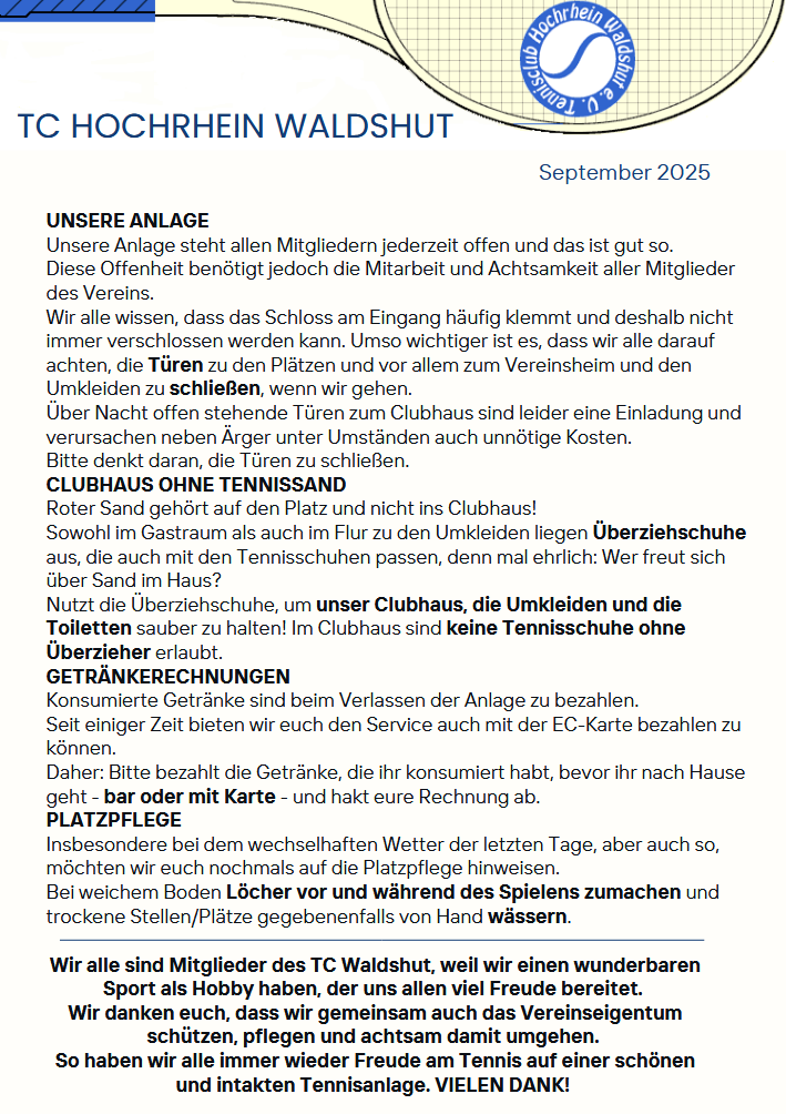 Seit mehr als 50 Jahren besteht unser Tennisverein, gelegen am Rheinufer in Waldshut, und bietet seit jeher sportliche und gesellige Aktivitäten für Tennisbegeisterte.